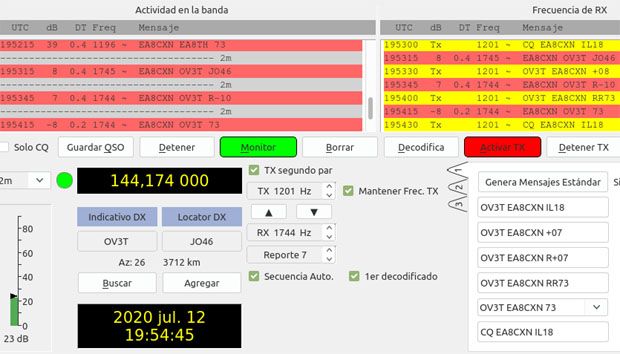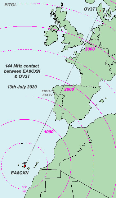 Back on the 12th of July 2020, there was a remarkable contact made on FT8 on 144 MHz between EA8CXN in the Canary Islands and OV3T in Denmark at about 19:55 UTC.