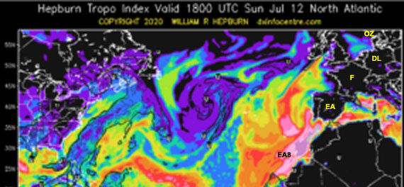 If you examine the right hand side of the map, it shows an enhanced maritime duct from the Canary Islands (EA8) to Spain and Portugal. This tropo path was confirmed earlier on the 12th when EB1DJ spotted EA8CXN on the DX Cluster.
